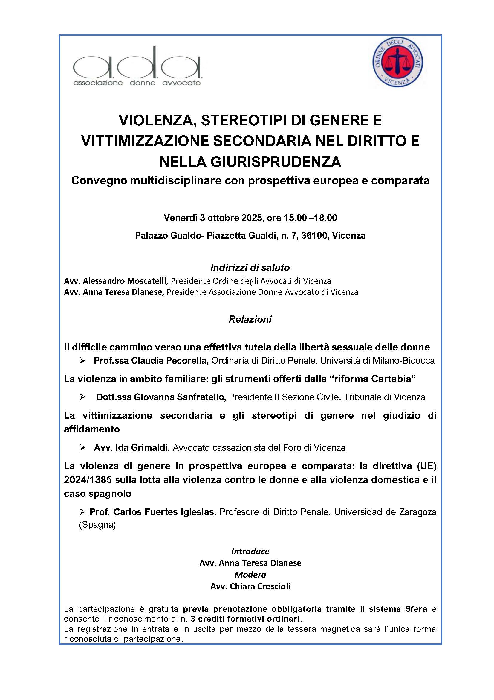 El día 3 de octubre de 2025, en el Marco del Ordine degli Avvocati di Vicenza, tendrá lugar el congreso titulado Violenza, Stereotipi di Genere e Vittimizzazione Secondaria nel Diritto e nella Giurisprudenza. Convegno multidisciplinare con prospettiva europea e comparata. En el mismo participarán diversos ponentes, como la profesora Claudia Pecorella, catedrática de la universidad Milano-Bocconi, la magistrada Giovanna Sanfratello y la abogada Ida Grimaldi. La ponencia internacional correrá a cargo del profesor doctor Carlos Fuertes Iglesias, de la Universidad de Zaragoza, quien pronunciará su intervención en análisis de la Directiva UE/1385/2024, en materia de protección contra la violencia de género, desde una perspectiva comparada.