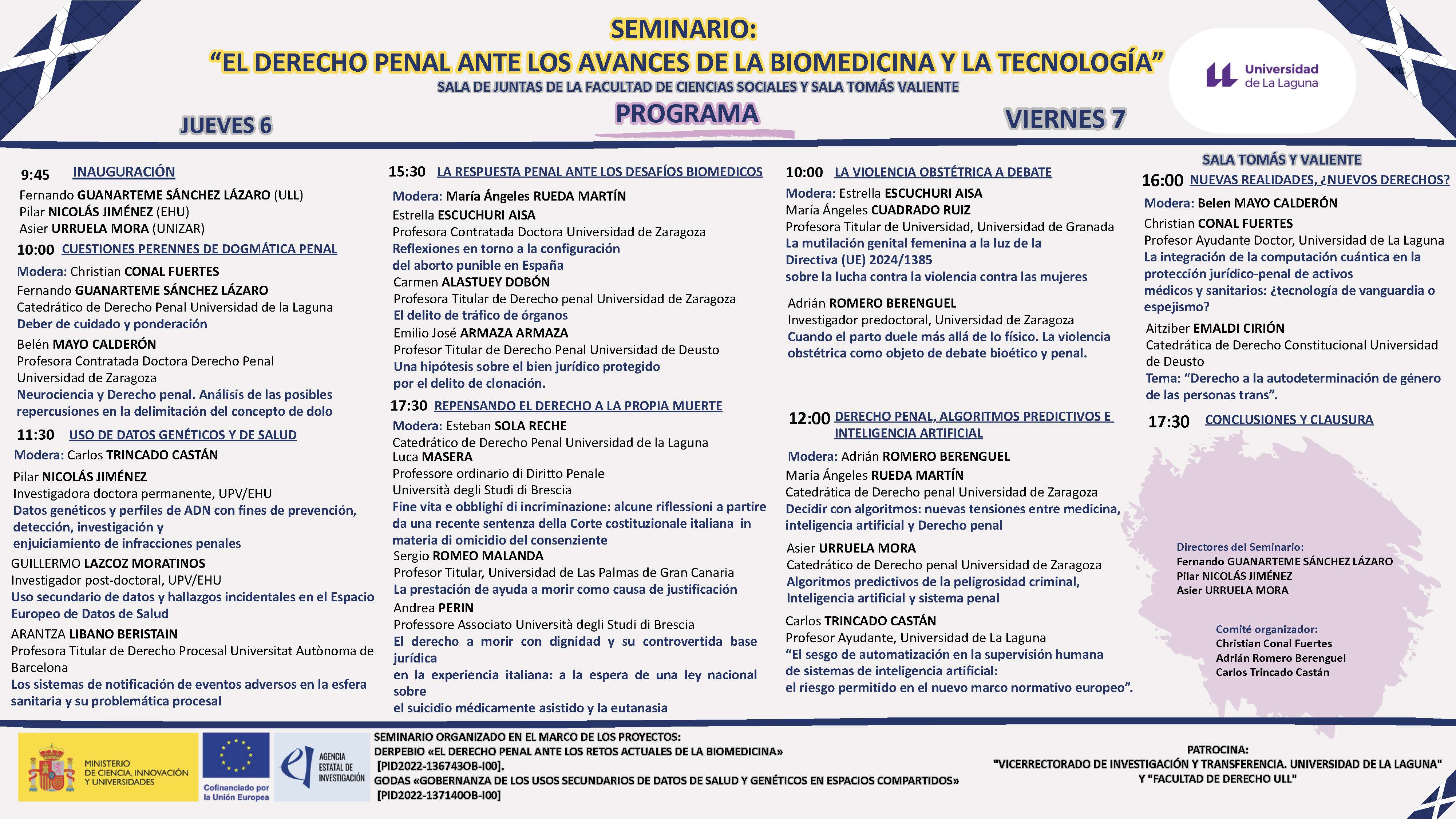 Durante los días 6 y 7 de noviembre de 2025 se celebrará en la Universidad de La Laguna el Seminario «El Derecho penal ante los avances de la biomedicina y la tecnología», organizado en el marco del proyecto de investigación DERPEBIO «El Derecho Penal ante los retos actuales de la Biomedicina» (PID2022-136743OB-I00), cuyos Investigadores Principales son el Dr. D. Asier Urruela Mora, Catedrático de Derecho Penal de la Universidad de Zaragoza, y el Dr. D. Emilio José Armaza Armaza, Profesor Encargado de Derecho Penal de la Universidad de Deusto.